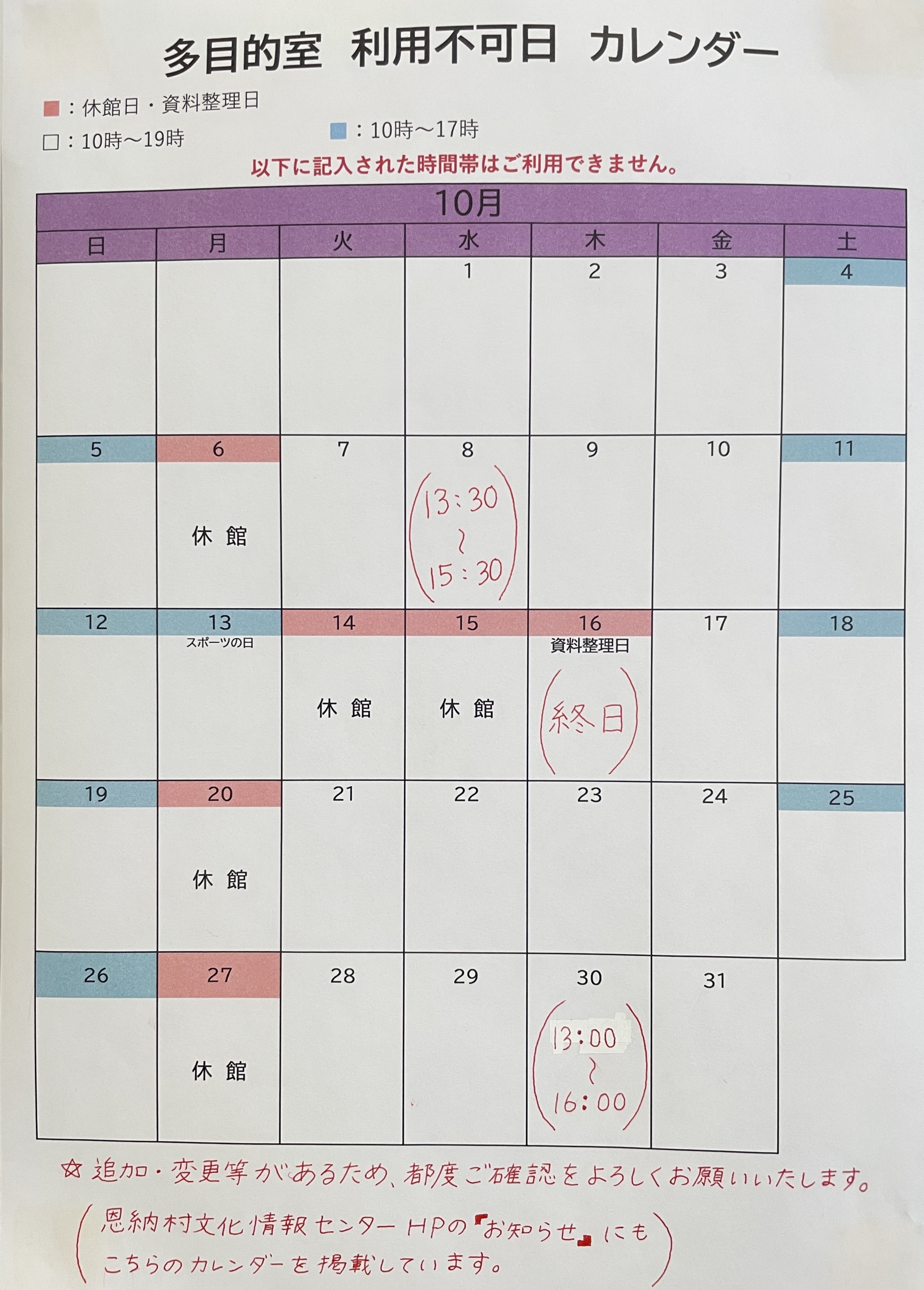 10月は下記の日程で多目的室を利用できませんので、ご了承ください。