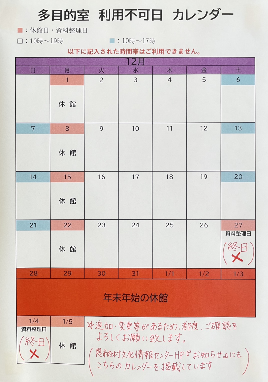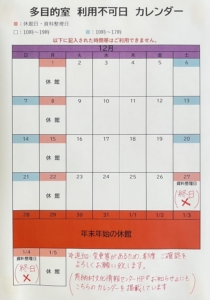 12月は下記の日程で多目的室を利用できませんので、ご了承ください。