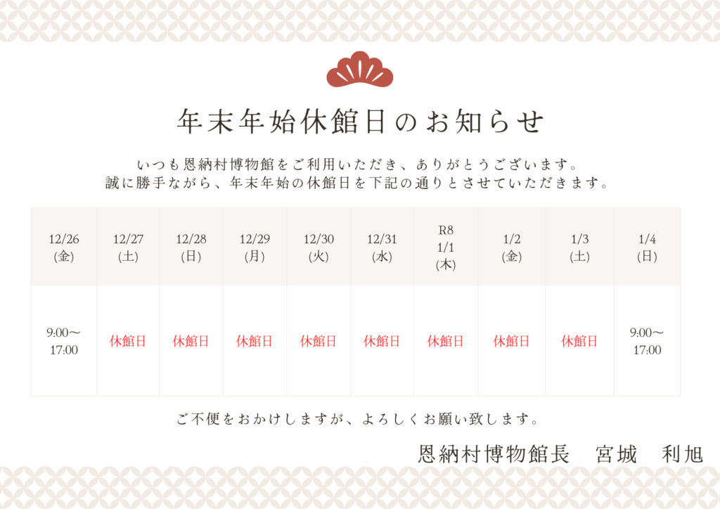 【恩納村博物館】12月の開館カレンダー及び年末年始の休館について