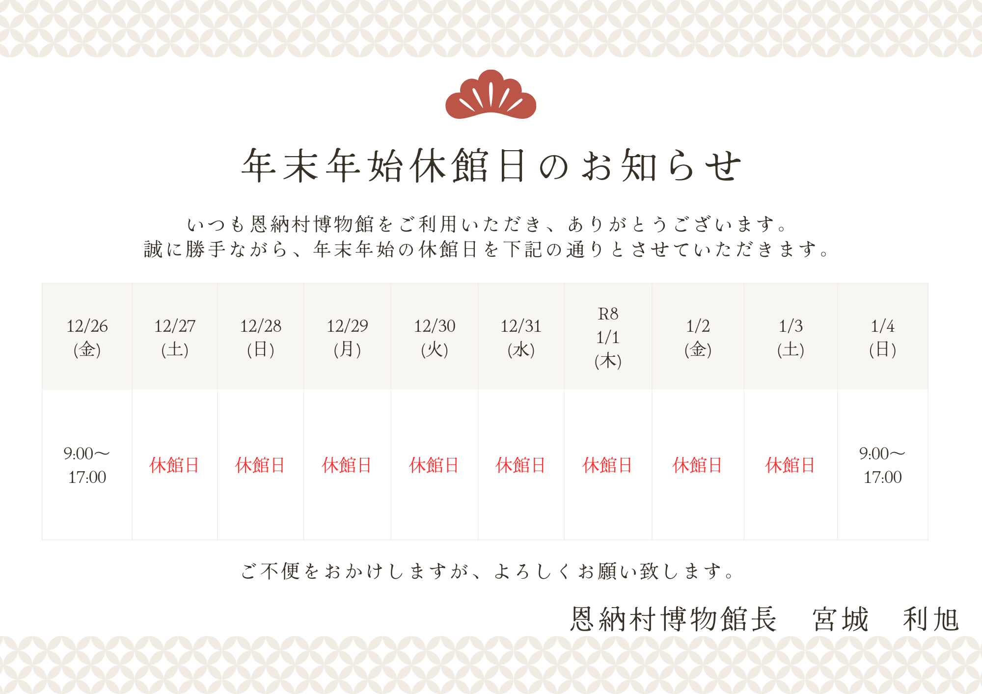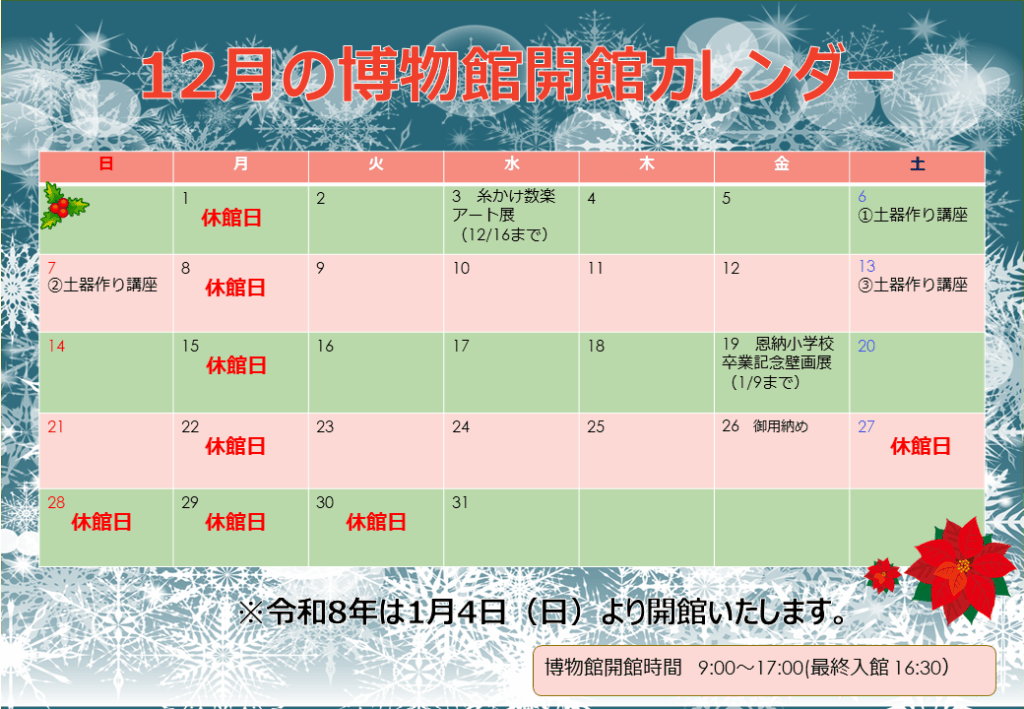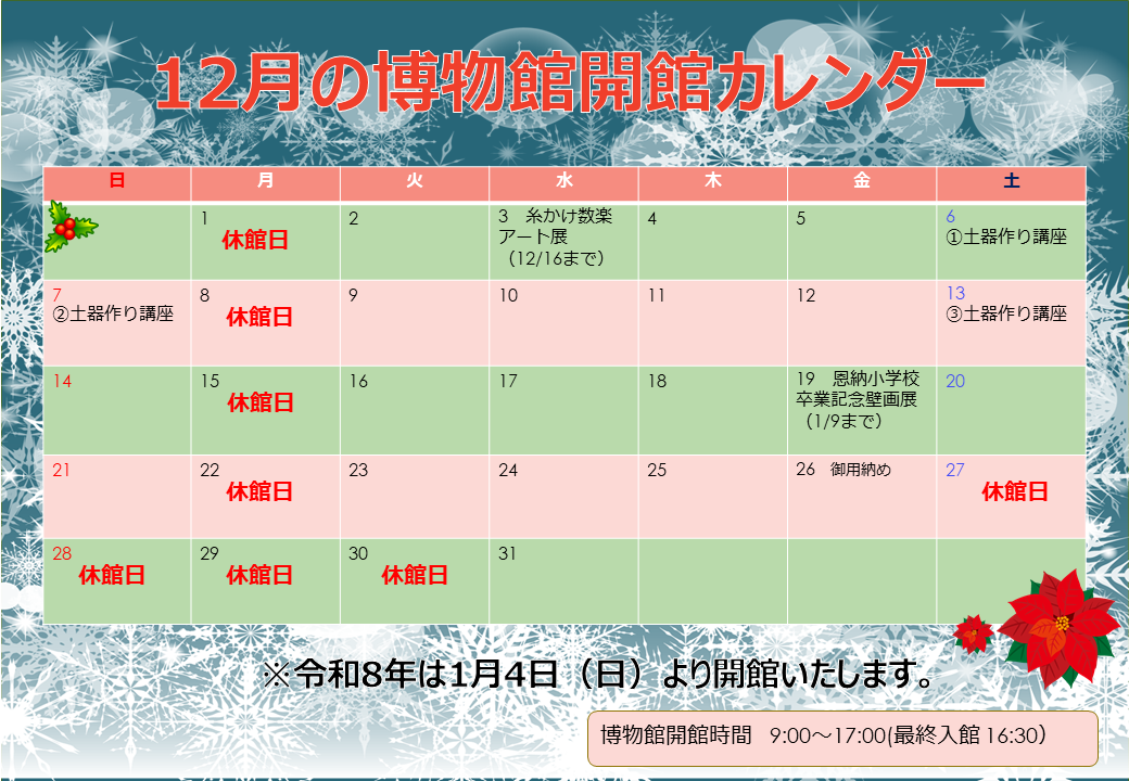12月の開館カレンダーと年末年始の休館のご案内です!