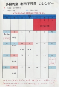 1月は下記の日程で多目的室を利用できませんので、ご了承ください。