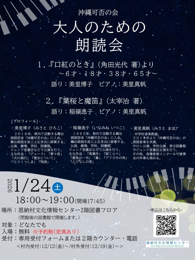 1月24日(土)開催のイベント「大人のための朗読会」につきましてお知らせいたします。