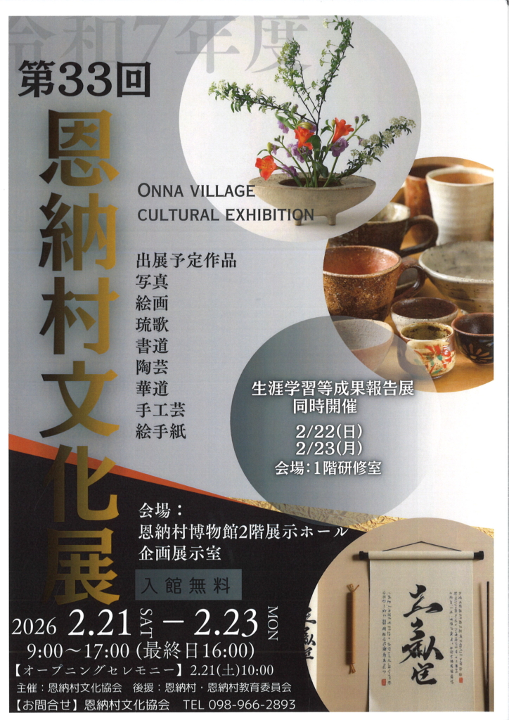 恩納村文化協会主催の「第33回 恩納村文化展」が恩納村博物館にて、2026年2月21日(土)~23日(月・天皇誕生日)まで開催されます。この機会にどうぞ、ご来館下さい。