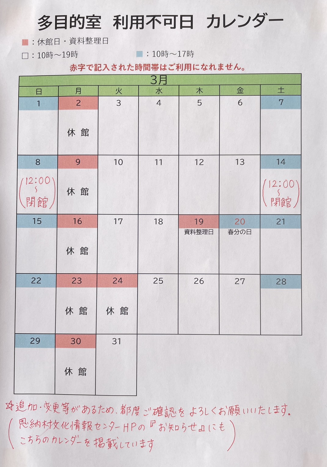 3月は下記の日程で多目的室を利用できませんので、ご了承ください。